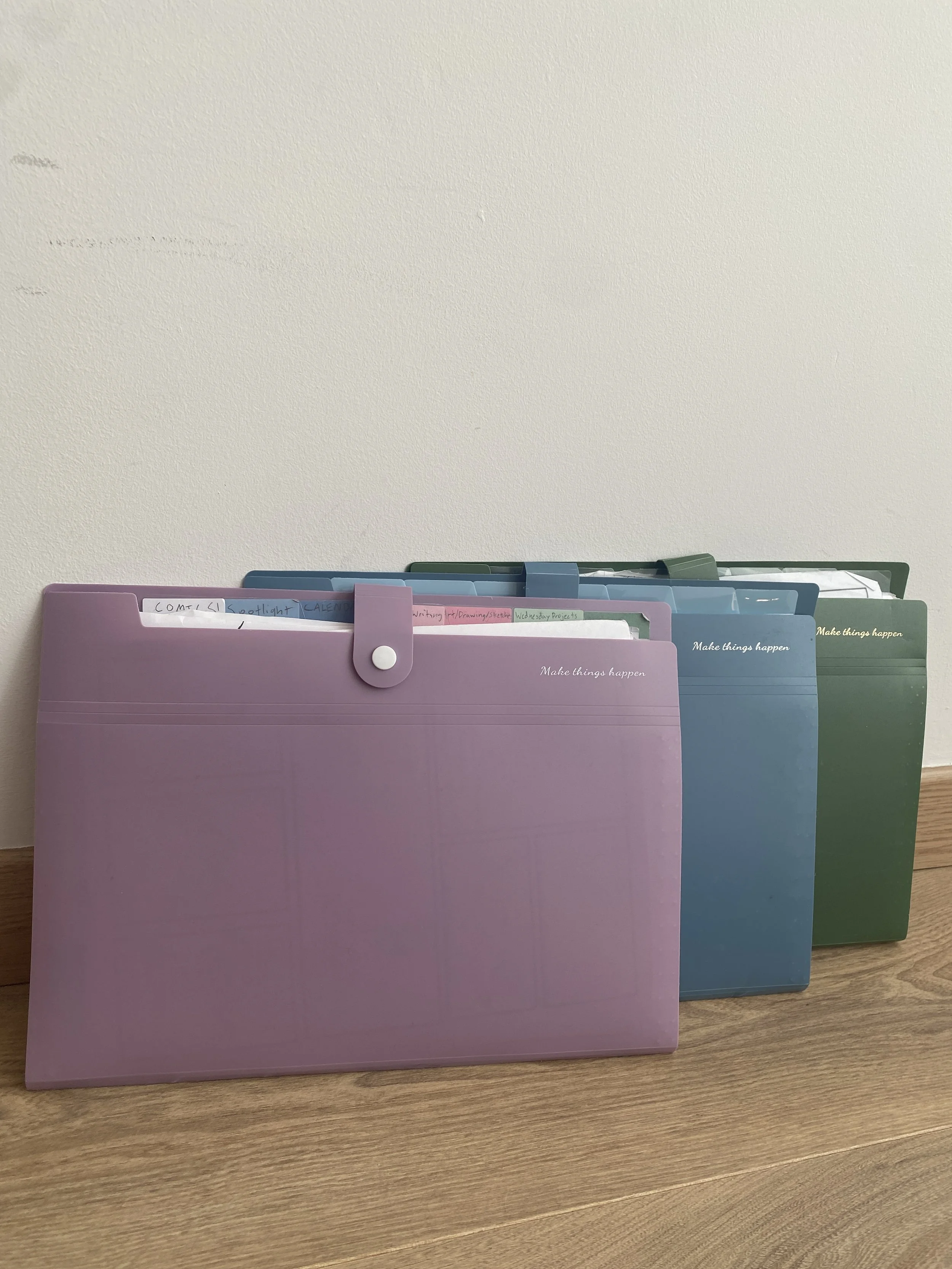 All the kids have a folder that we keep our school stuff and documents in, and they fit in our backpacks. Each one is a different color, and we have labels to keep them organized. Inside, we each have a piece of home. I have a drawing from my best friend Isaiah in my folder, along with some theater letters.